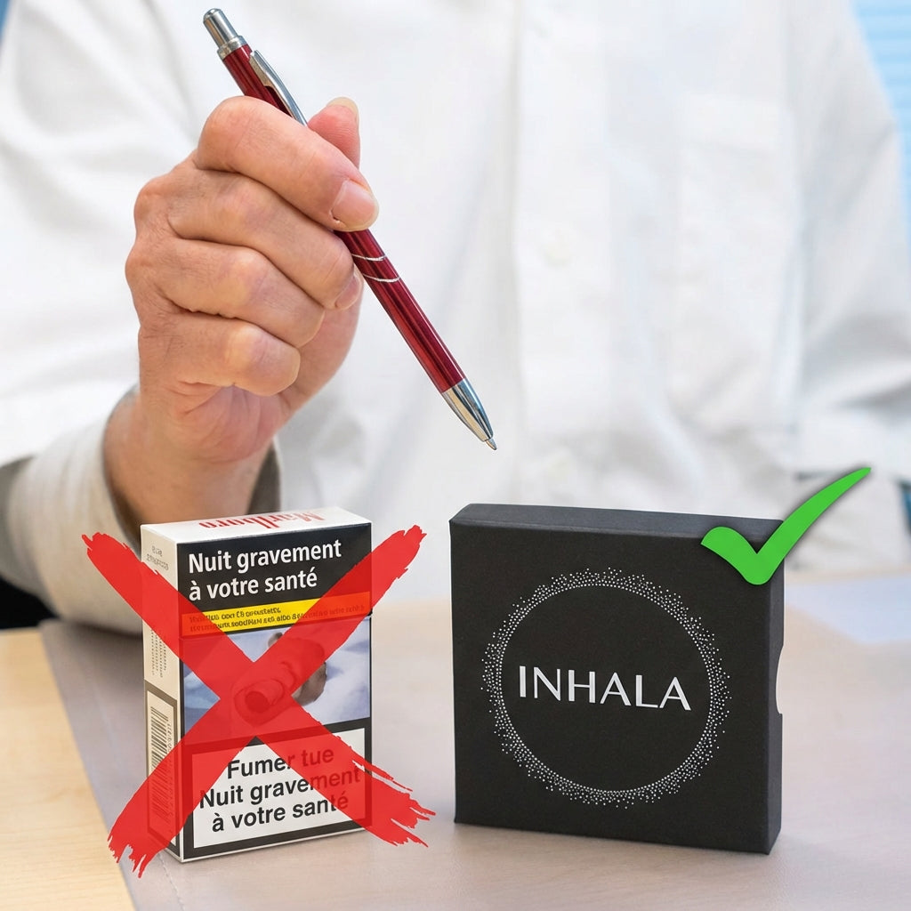 Le sevrage médicamenteux du tabac ou de la vapeur avec les médicaments conventionnels comme le Bupropion et la Varénicline présentent de nombreux risques pour la santé du corps et du psychisme en raison de leur composition chimique fabriquée en laboratoire. Le corps souffre souvent d'hypertension artérielle accrue, de nausées, de maux de tête et de troubles du sommeil. De plus, les produits chimiques entraînent des effets secondaires psychiatriques comme les sautes d'humeur, les états d'anxiété, la dépression et même des comportements suicidaires. Inhala, en revanche, est complètement sans produits chimiques et n'utilise que des matériaux naturels. - Abordable et efficace